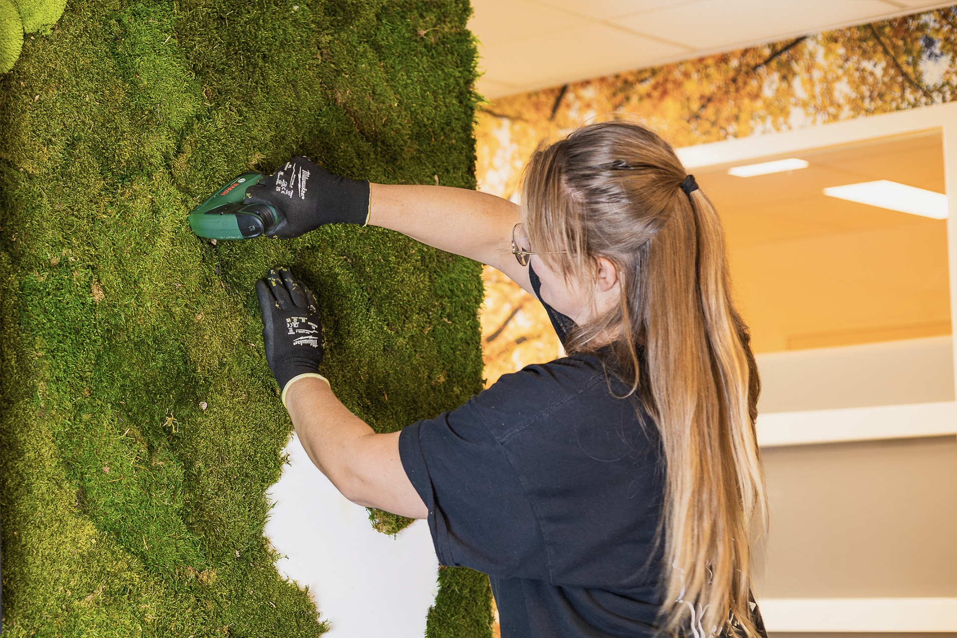 Heb je ervoor gekozen dat ik de moswand op maat direct op een wand op de werkplek kom plaatsen neem ik al het materiaal zelf mee, afhankelijk van de plaats en hoogte van de wand heb ik enkel de toegang tot